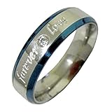 A blue trim polish finish stainless steel band ring with "Forever Love" and a cubic zirconia etched on it. The ring is 6mm wide and available from size 7 to 10. Stainless steel has high resistance to rust, corrosion and tarnishing. The stainless steel we used is high quality surgical stainless steel. This stainless steel is hypo-allergenic and is even safe to use for medical purpose. Stainless steel requires minimal maintenance in order to keep jewelry looking like new. You can get the matching women's ring to make this a couples ring set for your love ones (Product number 508511.9935W). Read more